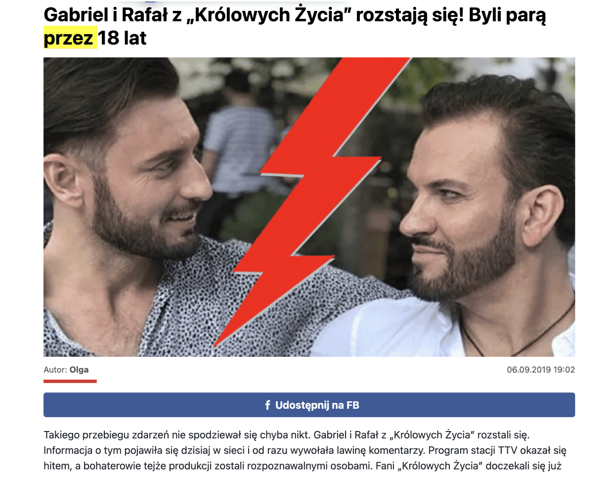Uwadze naszego czytelnika nie umknęła pewna istotna informacja. Otóż we wspomnianych artykułach znaleźć można informacje o tym, że „para” rozstała się w 2021 roku, po 18 latach „związku”.
